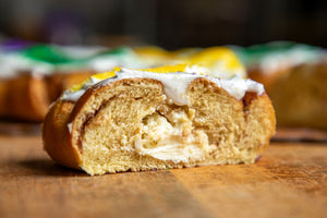 Experience the taste of New Orleans from home with Caluda’s Cream Cheese King Cake Kit! Each kit includes a freshly baked, un-iced brioche king cake filled with our rich, velvety cream cheese, plus all the festive toppings you need to decorate your own king cake — straight from our family bakery to your kitchen.